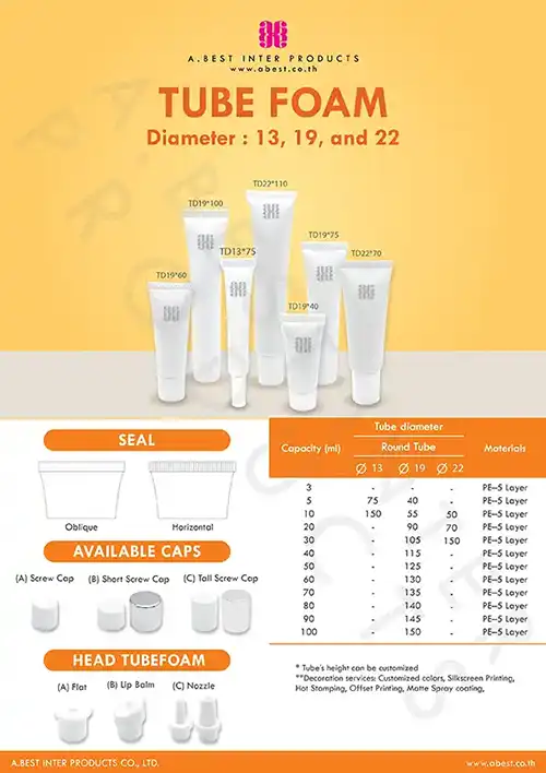 หมดกังวลเรื่องคุณภาพสินค้าไปได้เลย! หลอดบรรจุภัณฑ์พลาสติกของเราเป็นแบบ Multi-layer Tubes 5 ชั้น ที่ผลิตจากพลาสติก PE คุณภาพสูง โดดเด่นด้วยความแข็งแรงทนทาน ช่วยป้องกันความชื้นและคงสภาพกลิ่น สี รวมถึงคุณสมบัติของผลิตภัณฑ์ภายในได้อย่างสมบูรณ์แบบ เพราะมีชั้น EVOH ที่ช่วยป้องกันการรั่วซึมได้เป็นอย่างดี ทำให้สินค้าของคุณสดใหม่อยู่เสมอ และมีอายุการใช้งานที่ยาวนานขึ้น เรามีหลอดให้เลือกหลากหลายขนาด ตั้งแต่ 13 มม. ไปจนถึง 50 มม. และรูปทรงวงรี นอกจากนี้ยังสามารถเลือกจับคู่กับฝาได้หลายแบบ ทั้งฝาเกลียว, ฝาฟลิปท็อป ไปจนถึงฝาอลูมิเนียมหรูหรา เพื่อให้เข้ากับผลิตภัณฑ์ของคุณอย่างลงตัว ไม่ว่าจะเป็นครีมบำรุง, สครับ, เจลแต้มสิว หรือครีมกันแดด